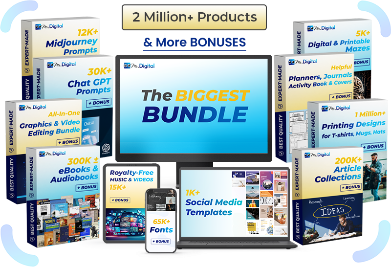 Maximize your selling potential on TikTok, Facebook, and Instagram! Explore the possibilities with our biggest bundle, boasting over 2 million digital products. Dive into our collection featuring eBooks, Audiobooks, Article compilations, Social media templates, Print designs, Graphics & Video editing resources, Digital & printable mazes, Royalty-free media, ChatGPT prompts, Midjourney prompts, Font collections and Planners, journals & activity books. Propel your sales growth strategically and assert your dominance in these essential sales channels!